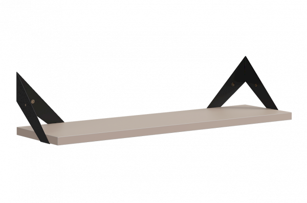 Полка крепится к стене с помощью чёрных треугольных держателей, которые обеспечивают устойчивость и долговечность. Особенность модели в том, что держатели можно расположить сверху, снизу или один сверху, другой снизу, что позволяет адаптировать полку под любые интерьерные решения и потребности.